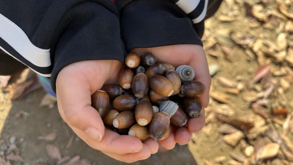 Mom:Wow, so many acorns today!(わぁ、どんぐりがたくさんあるね!)